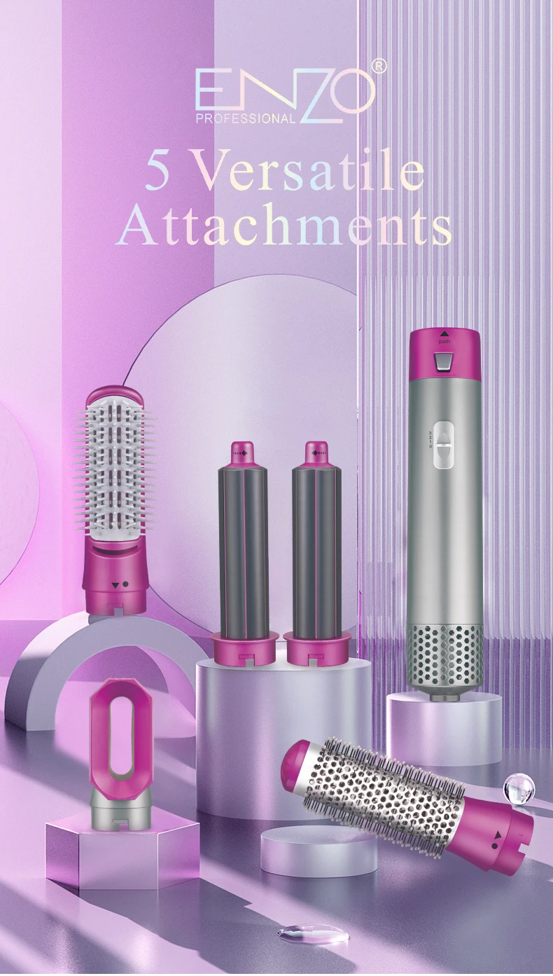 اداة تصفيف الشعر مع 5 ملحقات ساخنة قابلة للتبديل تجعل تجفيف الشعر وفرده وتمويجه وتدليك فروة الرأس أمرًا سهلاً.